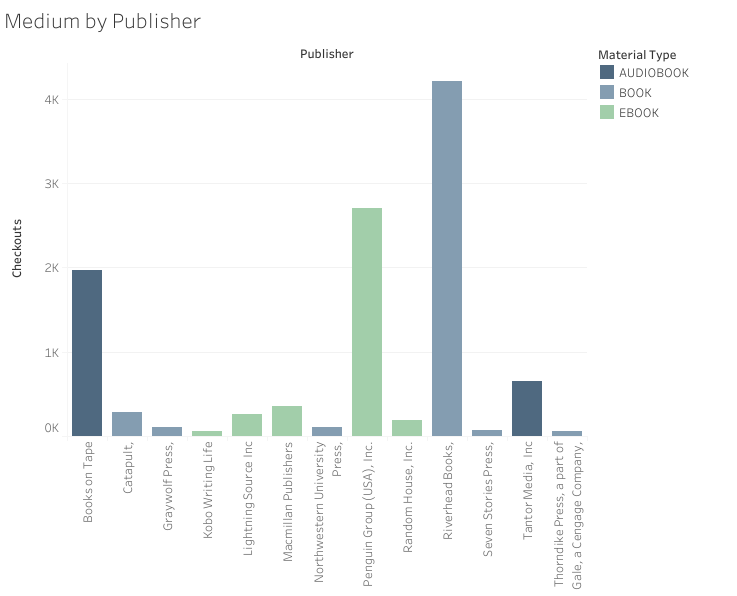 We can see that libraries must source different medium by the same author from several different sources: in fact, no two or more mediums are sourced from the same publisher. This increases the complexity of the library’s task in not only acquiring a variety of mediums, but also in terms of the information that goes into the database about each work. There doesn’t seem to be a consistent standard, based on my earlier data exploration work, and the variety of sources could play a role in this.