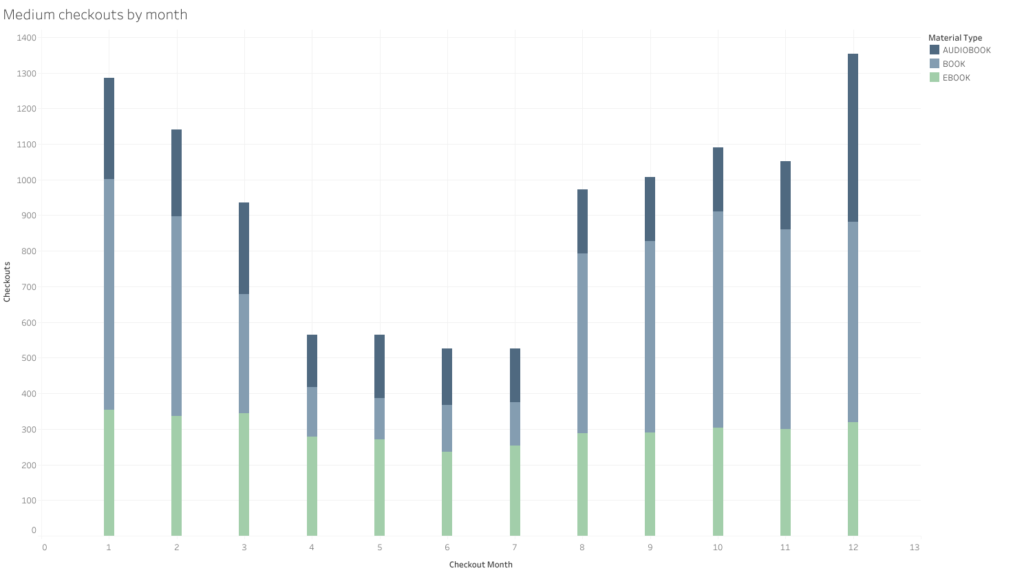 Really interesting and surprising! I nearly didn’t perform this analysis, but am so glad I did because it’s full of rich information. During the summer months, the checkout numbers of ebooks remain pretty solid with only a slight decrease, while checkouts of physical books sharply decline over the Pacific Northwest summer months. Possible reasons for this may be that people are simply traveling more and traveling lightly. Or, fewer books that may be included in literature curriculum in high school or college classes are being checked out. Similarly, audiobook checkouts also decline in the summer but by much less than physical books. However, audiobooks seem to surge around the winter holidays (maybe something to listen to while baking or gathering with family? Dylan Thomas?).