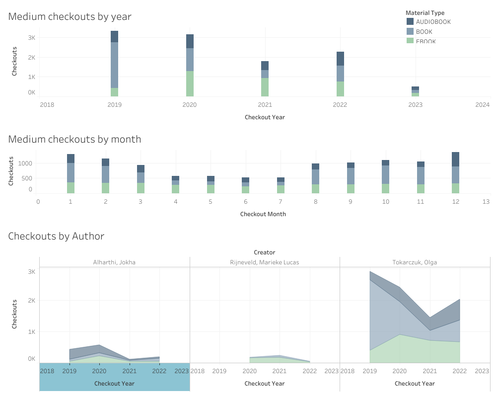 This dashboard consolidates the data. If it were possible to have a current live data stream for the rest of 2023, a dashboard like this would be very helpful in getting up-to-the-month prescient stats to be able to adapt even more quickly to borrowing trends. The legend is floating and applies across all charts. Including the author info helps to show how the data may be skewed by the popularity of a single author.